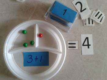 Ya está todo listo, así que ahora hemos de explicar a los niños en que consiste el juego. Les presentaremos el plato y el resto de materiales y les diremos que es un plato con algo de magia que se le olvidó en el bosque al hada de los números (es una fantástica motivación que les expliquéis una historia con algo de magia, para introducirlos de lleno en el tema y captar toda su atención. Y si lo decoráis, aún será más efectivo ya que creerán que efectivamente en el plato de un hada), y que ella aprendió a sumar y a restar con ese plato. Preguntad entonces si quieren jugar con él. Ya veréis, ya… Estarán más que dispuestos a jugar y a aprender tal y como hacía ella. Es entonces el momento de explicar concretamente en que consiste la actividad. La podéis presentar con tres opciones: la primera, en la que ponéis la operación y ellos cuentan las fichas y hacen la suma o resta; la segunda, en la que vosotros ponéis las fichas y ellos han de buscar una operación que encaje con la cantidad que hayáis puesto y además la resuelvan dando el resultado; y la última y más complicada (para niños más mayores), en la que solo deis el resultado y ellos han de buscar una operación cuyo resultado sea el número elegido y además contar las fichas que indique la tarjeta de la operación.