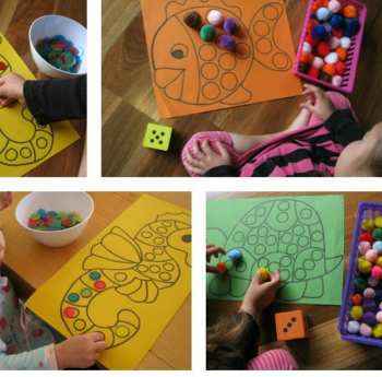 Los peques han de tirar el dado y cubrir tantas pequeñas formas geométricas del dibujo como indique el número. Se puede jugar de manera libre (como en la foto), o dirigida, si además añadimos otros criterios: