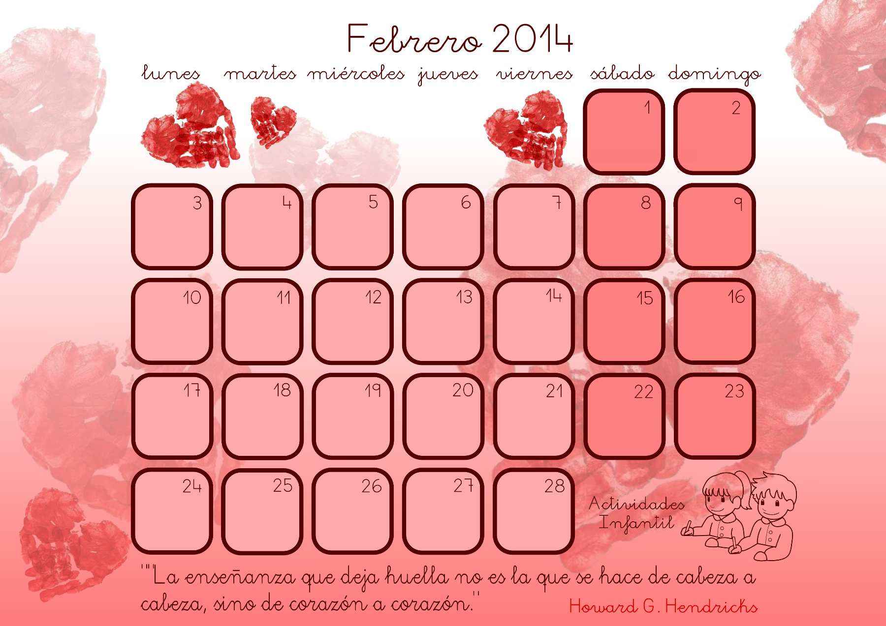 Os dejamos el calendario para el nuevo mes que llega muy pronto. Esta vez toca Febrero que es un mes lleno de corazones. Nuestros peques han juntado sus manitas embadurnadas en pintura roja y hemos hecho muchos corazones con los que hemos preparado la decoración del calendario.