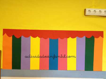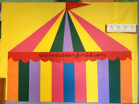 Un circo de colores es el protagonista de nuestro nuevo proyecto de aula. Y, cómo no, pedimos a los padres mediante una nota que trajeran cuentos, juguetes, libros y cosas relacionadas con el mundo del circo y de los magos. Así que nos pusimos manos a la obra y empezamos a montar un bonito mural en forma de circo. Para hacerlo utilizamos retales de cartulinas de colores recortadas en forma rectangular y pegadas por colores buscando una simetría (aunque lo podéis hacer como más os guste). En primer lugar hicimos la parte del frente de la carpa del circo y una vez acabada le pusimos un «volante» de cartulina roja.