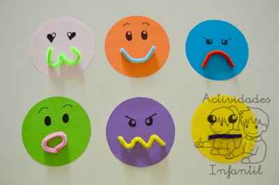 Uno de estos juegos es el de las caras sorprendentes, para el que tan solo necesitamos unos círculos de papel, unos trocitos de limpiapipas y unos rotuladores. Es opcional el uso de etiquetas con el nombre de las emociones y con las imágenes de las mismas (caras de gente con diversas expresiones).