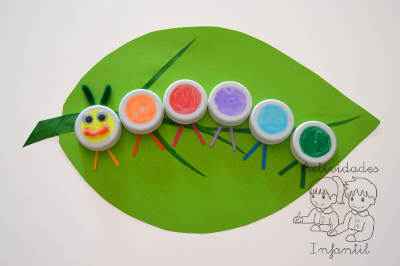Esta actividad podéis hacerla temática, es decir, si trabajáis el otoño, preparad la hoja de color marrón, roja, naranja o amarilla (los colores que trabajamos en otoño), y haced que el gusanito alterne los mismos colores excepto el que hayáis elegido para la hoja, para que destaque), si lo hacéis en invierno, pues podéis trabajar las gamas de los azules y lilas, si es en primavera una explosión de colores será lo ideal (como el de la foto), etc.