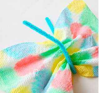 Esperamos a que se sequen. Una vez secos, solo necesitamos arrugar un poco por el centro y recogerlo con un trozo de limpiapipas del color que elijamos, que hará de cuerpo de la mariposa. Finalmente, doblaremos los extremos de los limpiapipas para dar estabilidad a nuestra manualidad y que quede con su toque final.