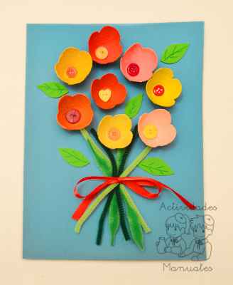 Cuando están listas y secas las hueveras que harán de flores las pegamos en una cartulina de un color vistoso que haga que resalte el ramo. Una vez pegadas les pegamos dentro los botones. Podemos combinar los colores buscando o los contrastes (por ejemplo: flor lila y botón naranja) o las armonías (por ejemplo: flor rosa y botón malva).