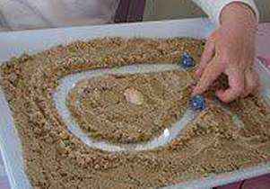 Para preparar el juego debemos extender la arena sobre la bandeja, y una vez extendida, con nuestro dedo realizaremos unos «caminos» de manera libre. Ya están listos para ser usados, entonces es cuando pedimos a los peques, que hagan rodar las canicas, empujando con su dedo y sin salirse del camino, hasta llegar a la meta (que aquí la podéis pedir).