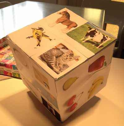 Una vez lista, la forraremos con papel adhesivo plástico, e imprimiremos en papel adhesivo las familias de imágenes. En cada cara del cubo hemos de colocar una familia de imágenes, por ejemplo… animales, frutas, los abuelos, los primos etc.