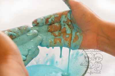 Dejad que los peques experimenten con ella, que se llenen sus manitas, que la aprieten y que crean que ya la tienen para ver sorprendidos y emocionados, como al abrir sus manitas, la bola de masa vuelve a convertirse en líquido entre sus manos de manera mágica. Y, permitidme que os de un consejo, animaos y experimentad también al lado de vuestros hijos!! No os arrepentiréis!!