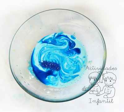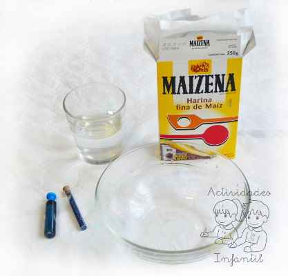 Para prepararlo solo necesitamos dos ingredientes: agua y harina de maíz (maicena), en estas proporciones: por cada taza de agua agregaremos dos de maicena. Además podemos añadir colorante alimentario para hacerla más atractiva y trabajar los colores, y algún elemento decorativo como hemos hecho nosotros que hemos añadido purpurina y le hemos dado un toque brillante.