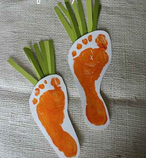 Para hacerlas solo necesitamos papel de color blanco y verde, pintura naranja, tijeras y pegamento, y la realización es fácil. Solo debemos pintar la planta de los pies a nuestros peques con pintura naranja especial para manos (que no sea tóxica en contacto con la piel), y estamparlas en un papel blanco. Una vez seca la estampación, recortamos su silueta y, finalmente, pegamos unas tiras de papel de color verde, que habremos preparado con anterioridad, a la parte posterior de manera que queden imitando a las hojitas verdes de las zanahorias. Y ya están listas!!