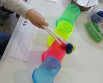 A continuación les proporcionáis a los niños una serie de vasos de plástico de los mismos colores que las notas (pintad las notas según los colores de los vasos que consigáis), y unos bastoncitos con bolitas para poder «tocar» música con los vasos.