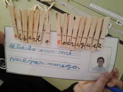 Es una actividad muy completa, ya que además de la atención necesaria para encontrar la letras entre el montón de pinzas y el desarrollo de la conciencia fonológica, o de destrezas como la motricidad fina, incorporamos el uso de la mayúscula en los nombres propios y la escritura espontánea de frases.