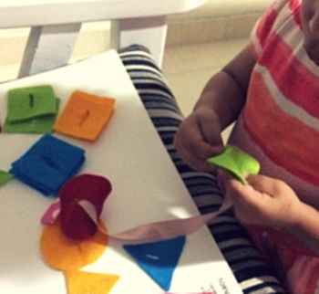 Para realizarlo solo necesitaremos: fieltro de colores, un botón (dependiendo de la edad y la destreza de los pequeños podemos poner botones más grandes o más pequeñitos. Empezaremos siempre por los botones grandes que hacen más sencilla la actividad), y cinta de tela (mejor de raso o de un tejido que facilite el deslizamiento de las piezas de fieltro).