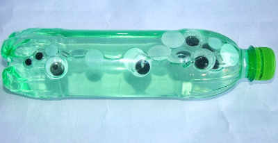 Y ya tenemos nuestra botella monstruosa, llena de ojos que no pararán de mirarnos! Es gracioso que los ojos se vayan moviendo dentro de la botella, por eso podemos colocar varias botellas monstruosas en el suelo en posición horizontal para que puedan rodar y ver la botella que llega antes rodando a la meta trabajando así la fuerza y el impulso de los peques, además de pasar un rato divertidamente monstruoso!!