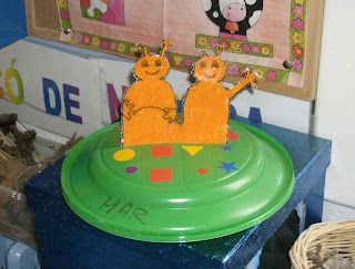 Estos extraterrestres tan simpático son un trabajo manual muy sencillo y además muy divertido. La confección es bastante sencilla: con dos platos de plástico pegados y decorados con unos gomets de colores, enganchamos unos extraterrestres muy simpáticos en la parte superior, y ya está. ¡Ahora a esperar que no nos abduzcan! Es un trabajo ideal para la educación infantil. Lo he bajado del blog Libretas de colores.