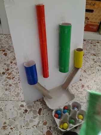 En primer lugar, pintaremos los rollos de papel cada uno de un color diferente y los pegaremos con celo uno al lado del otro en la plancha de porexpan (que haremos que tenga un soporte para que se quede vertical respecto el suelo o la apoyaremos en la pared). En la parte inferior de la plancha, situada en el centro, pegaremos con celo la huevera totalmente abierta. En los rollos de papel pegados en la plancha que quedan situados en las esquinas de la plancha, pegaremos debajo de ellos un rollo de papel de cocina partido por la mitad de forma que cree un caminito para cuando se deslicen las bolitas de plastilina por éste y caiga dentro de la huevera y no en el suelo.