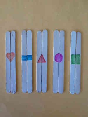 En primer lugar juntaremos los dos palos de polo uno al lado del otro, sin que quede nada de espacio entre ellos dos. Con rotuladores o lápices de colores dibujaremos encima de los dos palos de polo, justo en medio, una forma geométrica o figura simétrica (como por ejemplo un corazón). Al dibujar la figura en medio de los dos palos de polo estaremos dibujando una parte de la figura en un palo y la otra parte en el otro palo, haciendo que al separar los dos palos quede la figura partida justo por la mitad y sea igual que su pareja de palo de polo.