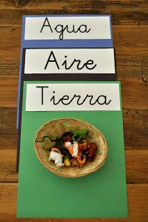 Las palabras de las tarjetas podemos hacerlas en el idioma que queramos que practiquen los niños, ya que las deberán leer en voz alta. El color de las tarjetas también ayudará a asociar la palabra con el significado; escribimos «mar» en una tarjeta azul porque el mar es azul, «tierra» en una cartulina verde por la hierba o marrón por el color de la tierra, y el aire podemos optar por el suave azul cielo, o por el color blanco de las nubes.
