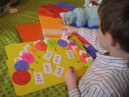 Para prepararlo necesitamos una cartulina grande que nos servirá de base, y papel de colores que recortaremos en círculos (10 y el que hará de cara del gusanito un poco más grande). En cada uno de los círculos escribiremos un número del 1 al 10 (podemos hacerlo más largo si las operaciones son más complicadas y requieren de resultados mayores).