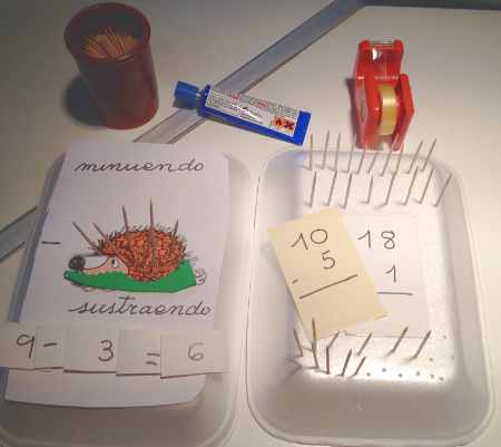 Escogeremos dos tarjetas con números y colocaremos la que tenga el mayor en primer lugar y a continuación pondrán sobre el erizo tantos pinchos como el número nos indica y luego ponemos la otra tarjeta tras el símbolo de la resta y deberán quitar tantos pinchos como indique el número, entonces finalmente, los peques deberán contar cuantos quedan y escribirlo en la etiqueta en blanco que también les habremos dado para que la coloquen en el lugar del resultado.