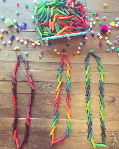 Los resultados pueden ser muy variados. Algunos pueden combinar diferentes colores, otros collares pueden ser del mismo color, pero de diferentes tonos. Todo depende de como le planteemos a los peques la actividad. Si la hacemos completamente libre, dejaremos que su creatividad trabaje y hagan las combinaciones que quieran. Si las hacemos dirigidas y les damos pautas, pueden ser diversas. Por ejemplo… Mismo color con diferentes tonalidades. Colores diversos, pero con un orden secuencial (con lo que estaremos trabajando también el concepto matemático de secuencia). Otra pauta puede ser hacer colores de las estaciones del año: blancos y tonos de azules para el invierno, verdes y amarillos para la primavera, naranjas y rojos para el verano, naranjas y marrones para el otoño.