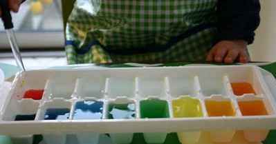 Si queréis trabajar los conceptos frío/caliente, grande/pequeño y antes/después, se puede permitir a los niños que cojan los cubitos con sus manos y experimenten con ellos antes de empezar a dibujar.