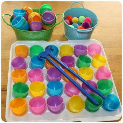 Una vez tenéis todo lo necesario, poned los pompones en un cubo, los huevos en la o las bandejas. Varias si habéis logrado guardar bastantes huevitos de colores. Abridlos en dos partes, de manera que una quede en la bandeja y la otra mitad la ponéis en el otro cubo. Poned las pinzas a mano y ya está. Ahora le pediremos a los peques que coloquen una bolita (pompón) de cada color en cada una de las mitades de los huevos que están en la bandeja. De esta manera, los pequeños han de buscar el color correspondiente, con lo que realizan un trabajo de repaso de los colores y otro de desarrollo de la destreza óculo-manual (al coger la pinza y colocar las bolitas) y de precisión (al colocar las bolas en el interior de su espacio sin que se salgan).