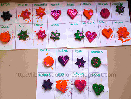 Este es el resultado final, una serie de bonitos llaveros que brillan con la luz propia de la ilusión y el amor que los peques han puesto en su preparación.