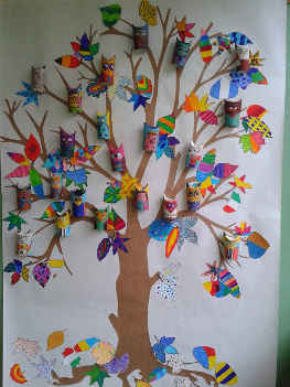 Un gracioso árbol con mucho color para decorar el aula. El árbol está realizado con papel de embalar de color marrón, y las hojas en blanco, han sido decoradas por los peques libremente, dejando su creatividad crecer y expresarse. Finalmente el toque más simpático lo dan estos graciosos búhos, realizados con tubos de cartón de papel higiénico reciclados