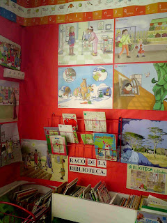 Tiene varios muebles para los libros, y una mesa para que los niños que acaben sus tareas y quieran ir a mirar (leer) un cuento, lo puedan hacer de manera tranquila y relajada. Además han decorado la pared con láminas de cuentos que van a ir trabajando durante el curso.