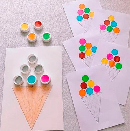 La actividad es sencilla. Les presentaremos a los peques la cartulina y los tapones y uno de los modelos de «helado» que habremos pintado en cualquiera de las otras hojas. Les pediremos que, se fijen con atención y «monten» el helado igual que el del modelo. Para ello, deberán fijarse en los colores, en su situación en el dibujo, elegir el tapón correcto y colocarlo, enroscándolo, en el lugar que le corresponde. Al realizarla, además, repasarán los colores y diversos conceptos matemáticos, como arriba/abajo y los números del 1 al 6.