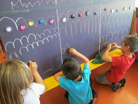 Un ejemplo puede ser la que veis en la imagen. En ella los peques trazan lineas en una pizarra, utilizando cápsulas de café de colores. Os explicamos cómo prepararla.