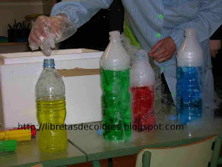 Eso me dio una idea, ¿y si lo mezclábamos con agua de colores?, ¿cómo saldría el humo?. Así que otro día volvimos a hacerlo, pero esta vez con un cuento incluido. Era sobre la primavera. Preparé cuatro recipientes de agua transparentes , las llené de agua que coloreamos con papel pinocho de cuatro colores, azul, amarillo, verde y rojo.