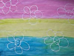También se puede hacer el dibujo con ceras de colores pero pierde el efecto mágico, por que ya vemos el dibujo antes de cubrirlo con acuarelas para pintar el fondo.