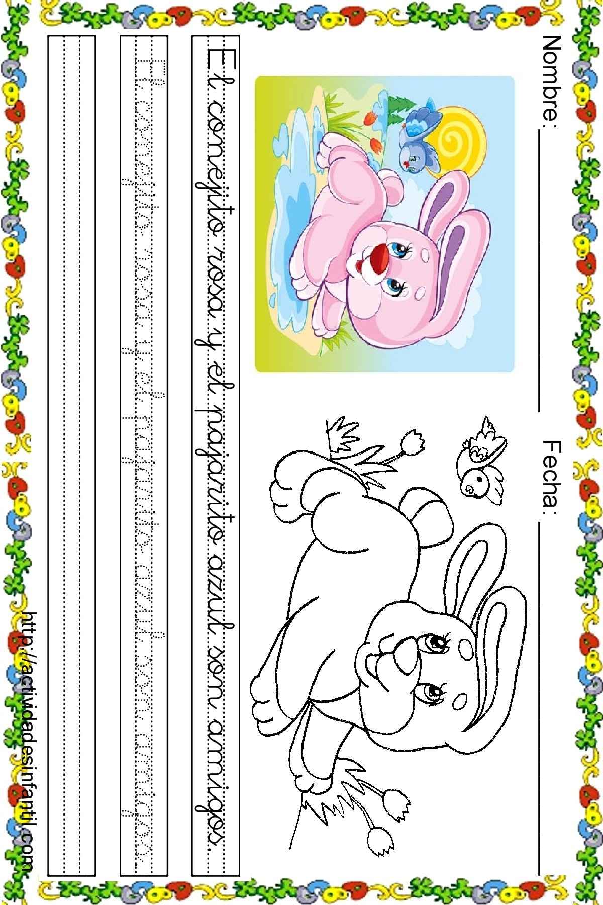 Lectoescritura para niños. Un simpático conejo ayudará a que los peques aprendan las letras y su trazo. Además podrán colorear el dibujo.