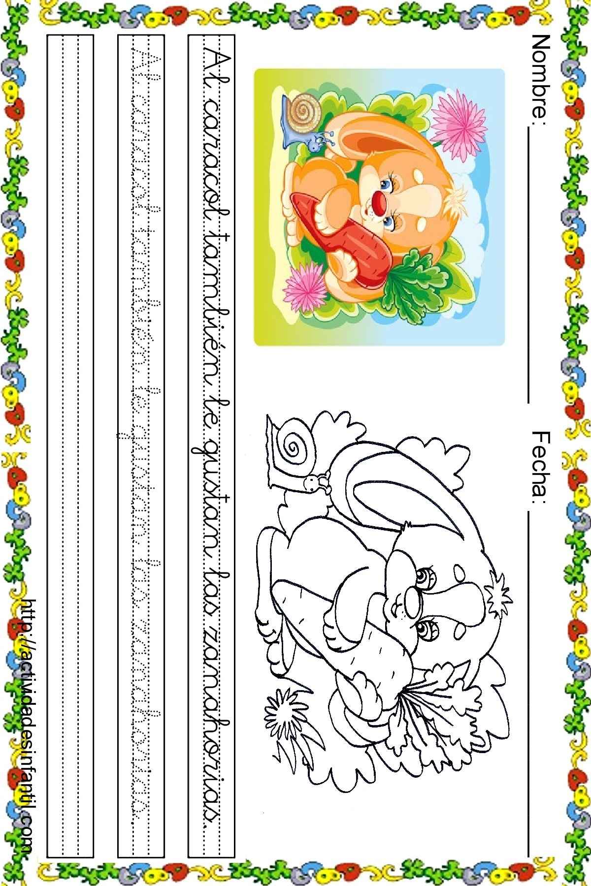 Lectoescritura para niños. Un simpático caracol y su amigo el conejito ayudarán a que los peques aprendan las letras y su trazo. Además podrán colorear el dibujo.