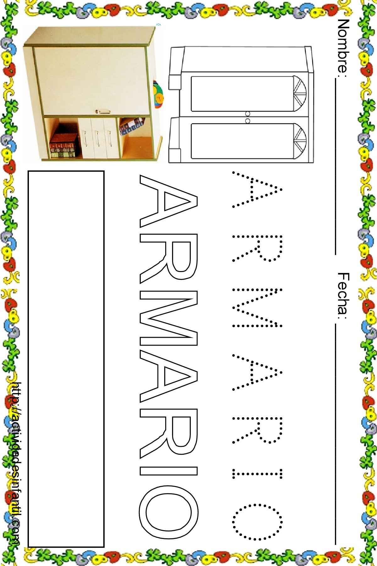 Fichas de lectoescritura para niños: Vocabulario escuela: armario. Unas fichas para que los peques aprendan las letras y su trazo.