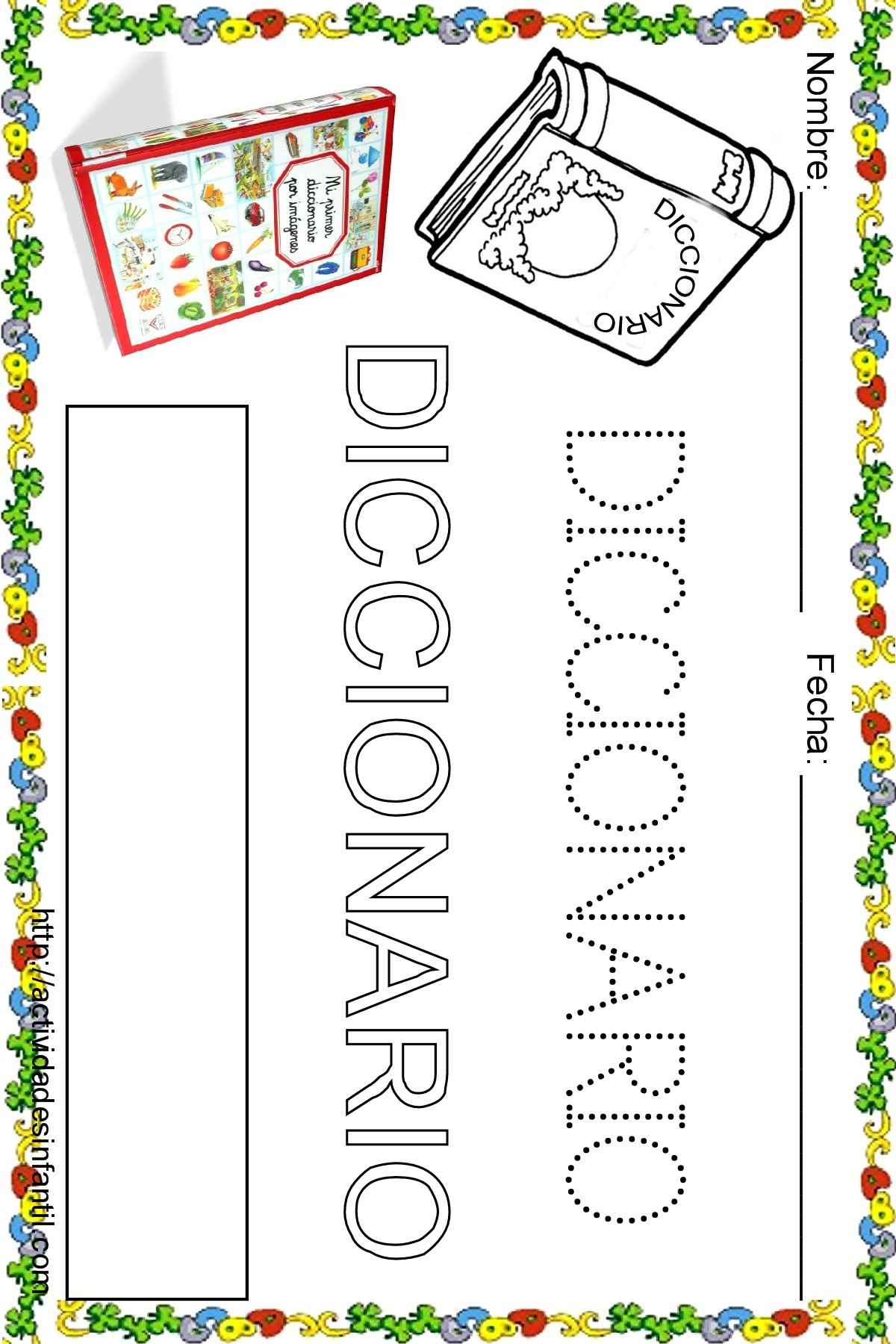 Fichas de lectoescritura para niños: Vocabulario escuela: Diccionario. Unas fichas para que los peques aprendan las letras y su trazo.
