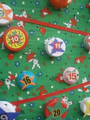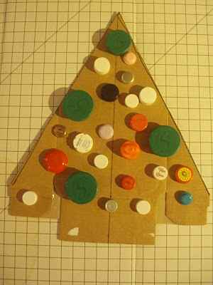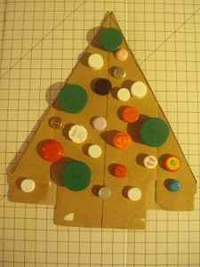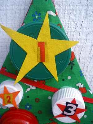 Está realizado con elementos reciclables. Sobre una base de cartón posteriormente forrada y decorada (puede ser en papel, tela o incluso la podemos simplemente pintar), enganchamos tapones de botellas o botes que ya no utilicemos en casa. Cada tapón ha de llevar un número enganchado sobre una estrella, para que quede más decorativo. Recordad que solo deben haber 24 tapones. Antes de engancharlos, introducimos en su interior una pequeña sorpresa que los niños descubrirán al ir destapando los tapones conforme vayan pasando los días. Podéis poner desde las típicas chocolatinas, golosinas, o incluso algún pequeño juguete si el tamaño del tapón lo permite.
