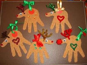 El material que aquí se muestra es una plancha de corcho fino, pero puede también hacerse con cartulina de color marrón. Unos ojitos móviles, algún lazo de color llamativo, unas lentejuelas, y un poco de limpia pipas brillante, y podéis confeccionar con los pequeños estos estupendos motivos navideños para colgar en el árbol.