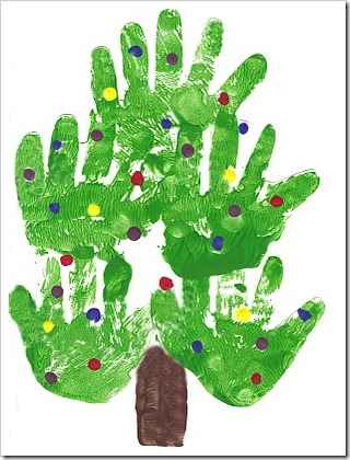 Otro árbol navideño hecho con las manos de los más pequeños y un poco de pintura verde. Para darle el toque final, se han utilizado gomets de colores. Ah! y no olvidéis el tronco en marrón.