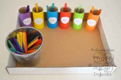 La actividad consistirá en que los alumnos deberán colocar los palitos dentro del espacio que tenga su mismo color. Si se quiere hacer más difícil la actividad podemos añadir otro item más a la clasificación: la cantidad. En ese caso deberemos colocar en la etiqueta un número y los niños tendrán que colocar tantos palitos del color como indica dentro del rollo correspondiente.