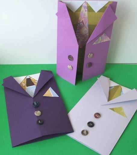 Os dejo esta bonita manualidad que es perfecta para felicitar a los papis en el Día del Padre. Para realizarla solo necesitáis una hoja de papel del color que queráis con dos dobleces de manera que cierren en el centro. Se le realizan unos pequeños pliegues en la parte superior a modo de cuello. Unos botones pegados con cola. Y unos detalles hechos también de papel, haciendo de corbata y pañuelo en un costado.