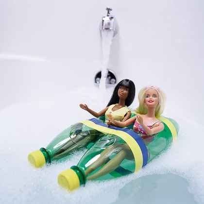 Divertidos barcos reciclables para muñecas estos que os traemos hoy. Fijaos que sencillo es preparar un barco a los muñecos de nuestros peques. Solo necesitáis dos botellas abiertas por la parte de arriba para poder introducir a los muñecos como si fueran en una canoa. Las enganchamos con cinta adhesiva por dos partes para fijarlas bien, y ya tenéis una simpática barca para nuestros amigos de juegos.