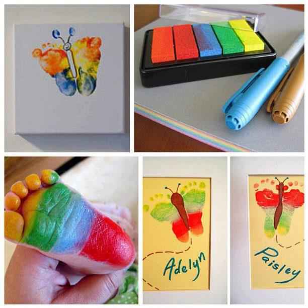 Con pintura de colores y un par de pequeños y curiosos pies, podemos decorar postales, realizar dibujos, hacer papel estampado, etc., cualquier detalle primaveral que realicemos quedará estupendo con un par de coloridas mariposas.
