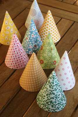A continuación, con papel de colores haremos los tejados. Recortaremos unos círculos y luego haremos unos cucuruchos con ellos, pegándolos con cola en sus extremos. Pegaremos estos tejaditos a las casitas hechas con los rollos.