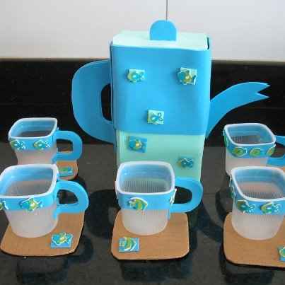 Las tacitas son envases de flan vacíos, al que hemos enganchado con cola una tira decorativa de goma eva y una asa del mismo material. Los platitos realizados con un trozo de cartón en el que se ha pegado el motivo decorativo del pez para que haga juego con las tazas.