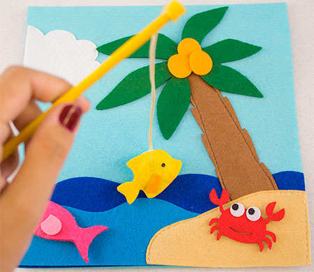 Le damos a nuestros alumnos unos palitos (perfectos los palillos para comida china) a los cuales hemos atado un cordel con un imán en su extremo. Los niños han de pescar los peces que se quedarán enganchados con clip al imán. El juego consiste en la pesca, pero podemos utilizarlo para diferentes objetivos. El principal de estos objetivos es el desarrollo motriz y de la coordinación óculo-manual del niño. Aparte de este importante aspecto trabajado, podemos trabajar además conceptos matemáticos: como el tamaño (pescar solo los grandes, o los pequeños), las clasificaciones por colores (pescar solo los peces rojos, o los naranjas, o los amarillos, etc), las cantidades (pescar un número determinado de peces), el concepto dentro/fuera (si ponemos un trozo de fieltro marrón imitando una cesta, han de poner los peces que van pescando dentro), etc.