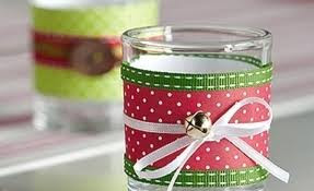 Recortamos una tira de papel y la pegamos alrededor del vaso procurando que quede bien enganchada. A continuación cortamos una tira de la cinta de raso y la pegamos también alrededor del vaso, por encima de la tira de papel. Dejamos los extremos largos para hacer un lazo, pero antes enganchamos con la cinta un cascabel. A continuación anudamos y fijamos el lazo. Finalmente, introducimos una pequeña vela en su interior.