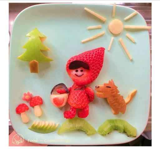 En nuestro apartado de cocina os presento este divertido y sano plato de fruta para que los más pequeños se animen a comerla. Una simpática Caperucita Roja, y su amiguito el Lobo, seguro harán las delicias de los niños a la hora de la merienda. No olvidéis que la fruta es muy beneficiosa para los niños, ya que son alimentos que ofrecen muchas ventajas en general tienen un alto contenido de agua, estimulan el funcionamiento de los riñones, la mayoría contiene fibra –que estimula el tráfico intestinal- y es una forma deliciosa de refrescarse con bajas calorías y muchas vitaminas. Además, son fáciles de comer, pueden prepararse de diversas maneras, tienen un sabor dulzón agradable y pueden encontrarse todo el año.