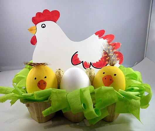 Una vez que hemos acabado de realizar la gallinita y los pollitos, solo hemos de colocarlos en la huevera. Por una parte tendremos los tres huevos que, además, encajarán a la perfección en los huecos de la huevera. Y en la parte posterior de los huevos, colocamos la gallina, pegando la parte inferior con cola al cartón. Os quedará un precioso nido que gustará mucho a los niños.